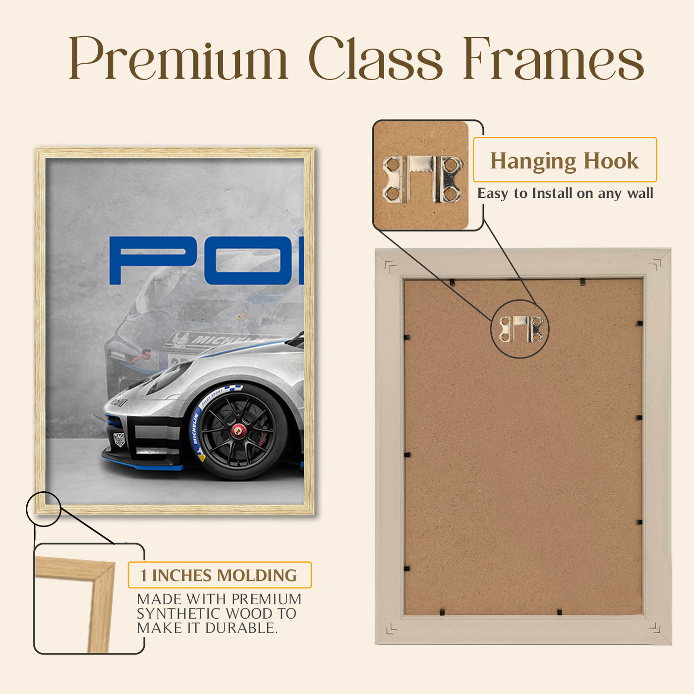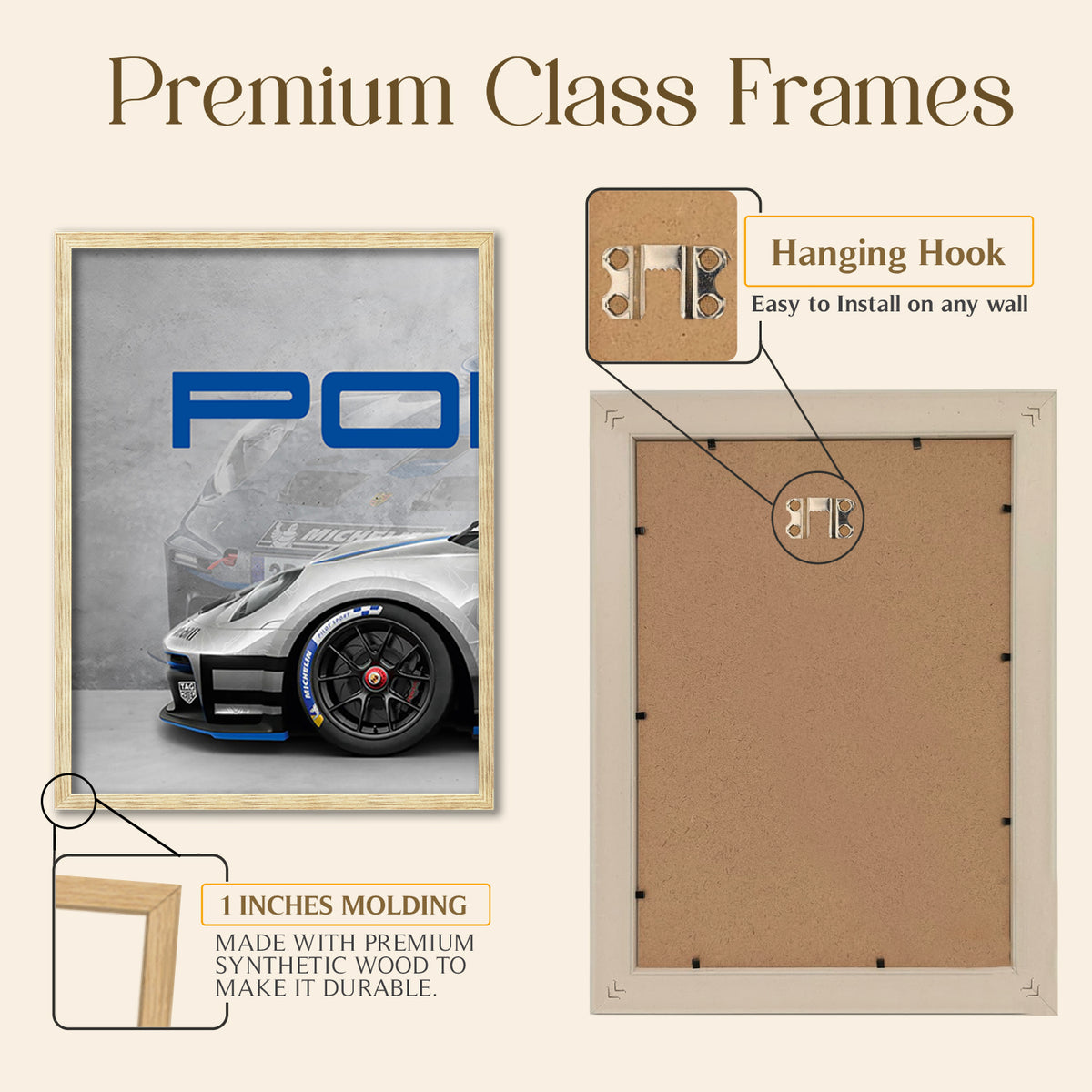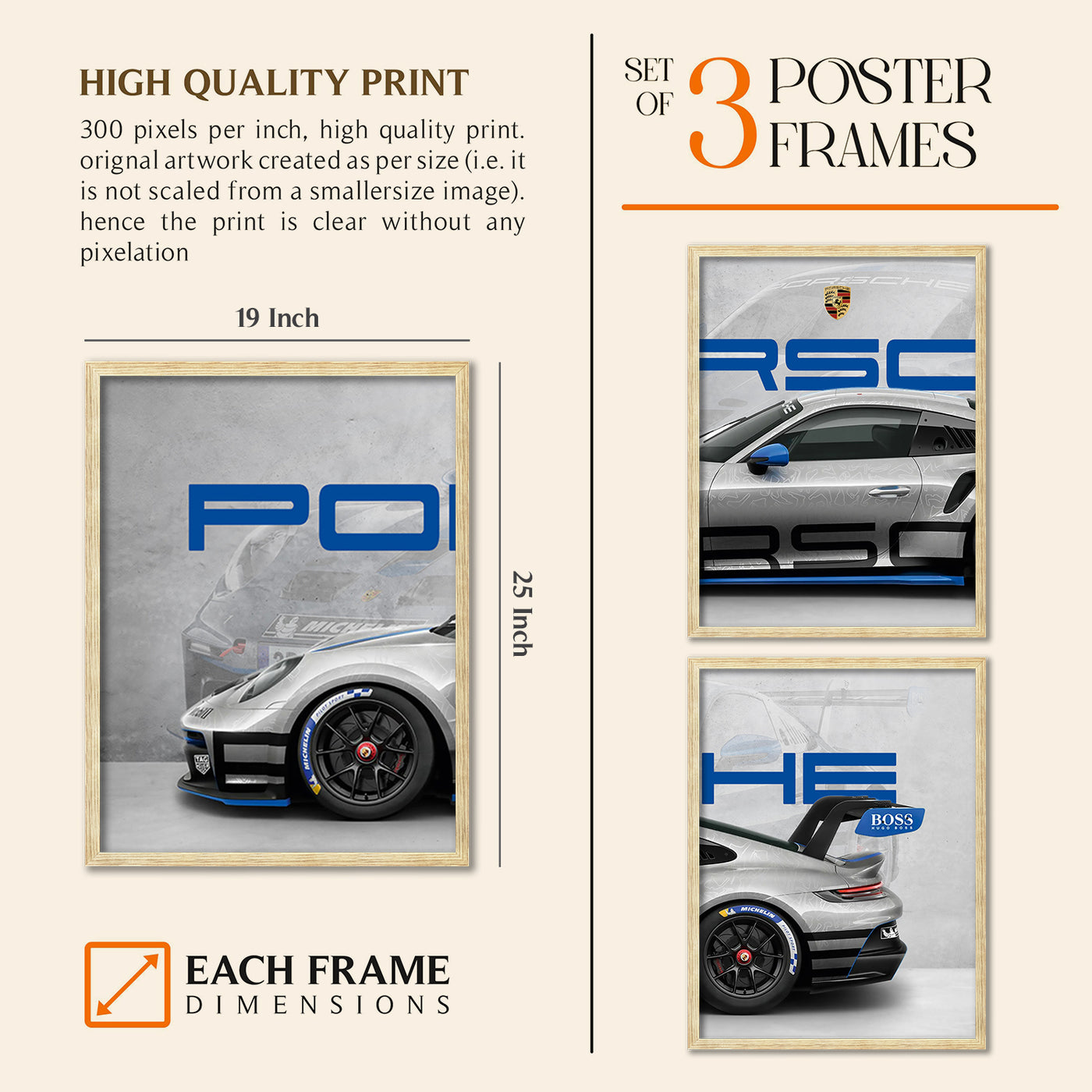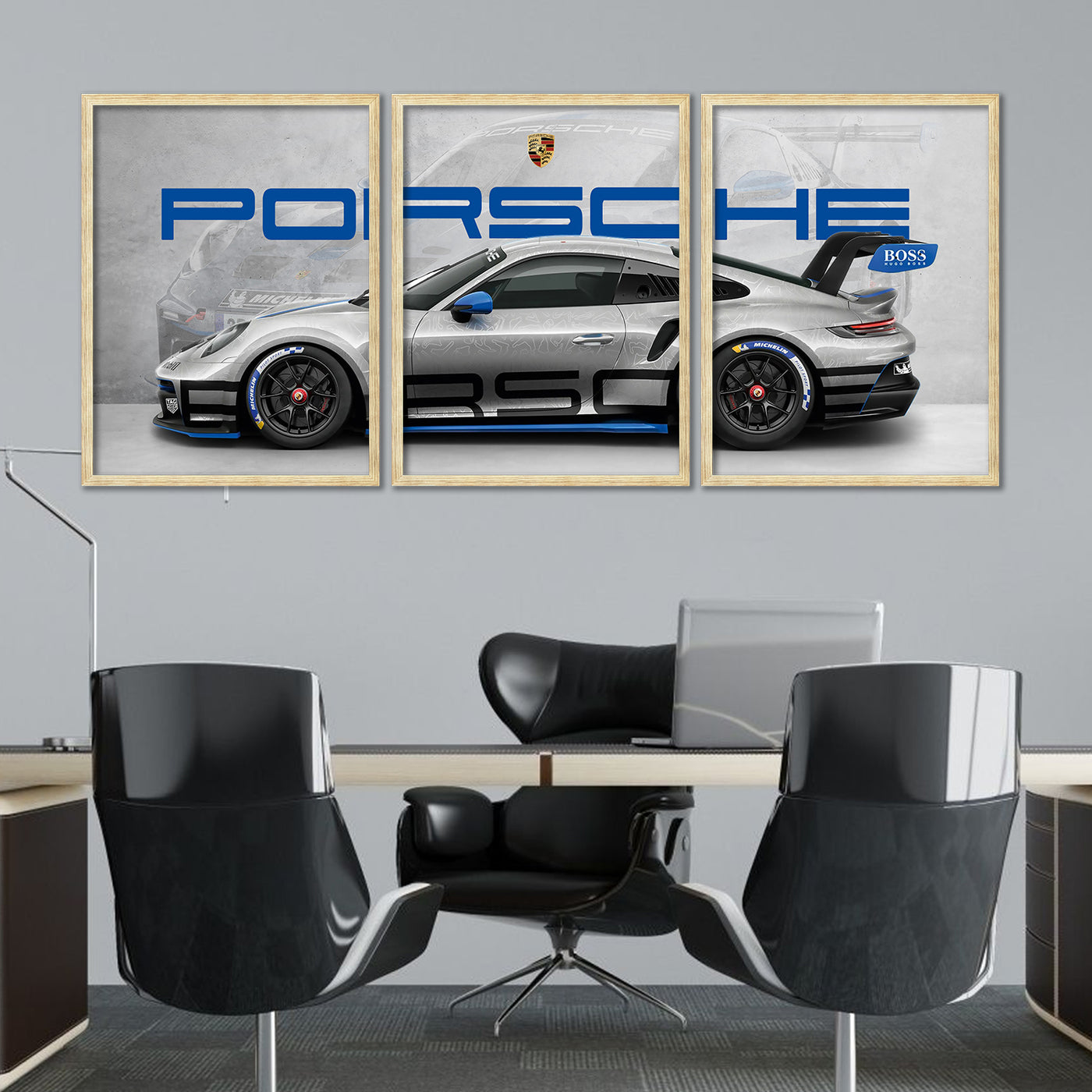 Transform your living space into a sophisticated automotive gallery with this stunning set of three framed Porsche wall posters from ARTELLY. This captivating triptych showcases a sleek white Porsche sports car in dynamic detail, split across three premium frames that create a dramatic panoramic effect. The iconic Porsche crest and bold blue lettering add authentic brand appeal, whilst the artistic grey background with subtle sketches provides depth and visual interest. Crafted with high-quality printing on premium MDF wood, each frame features sparkle lamination that enhances the vibrant colours and protects against fading. The durable construction ensures long-lasting beauty, whilst the easy-to-clean surface requires only a damp cloth for maintenance. Perfect for decorating bedrooms, living rooms, home offices, or man caves, this versatile wall art set instantly elevates any interior with its modern automotive aesthetic. Easy to install and ready to hang, these framed posters make an exceptional gift for car enthusiasts, boys, and anyone who appreciates fine automotive design. The large size creates impressive visual impact, turning any wall into a focal point that celebrates the legendary engineering and timeless style of Porsche.