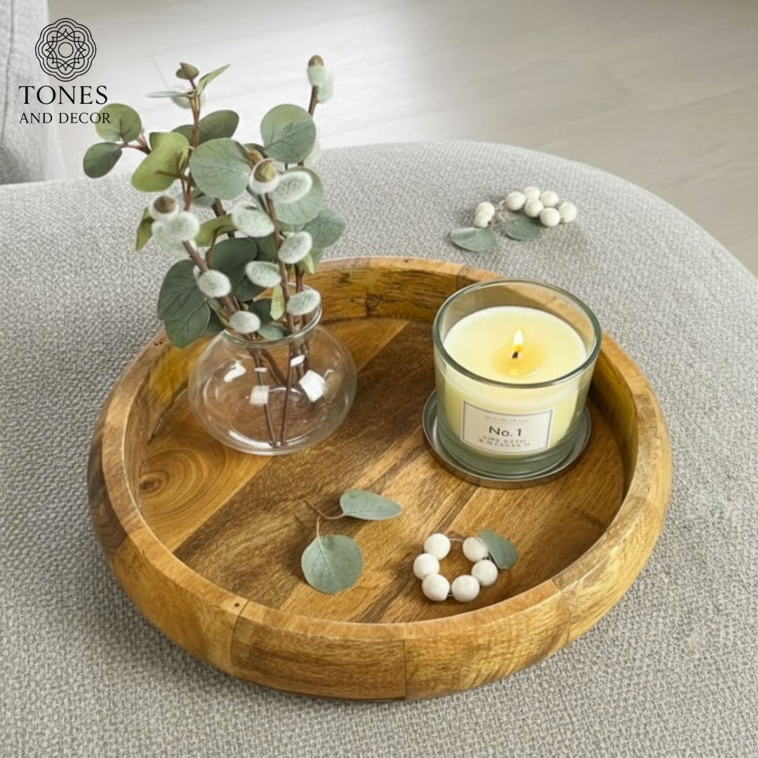 Bring natural elegance into your home with this beautifully handcrafted 33 CM Round Mango Wood Tray. Designed with a smooth finish and rich wooden grain, this tray is perfect for styling candles, vases, plants, and decor accents.