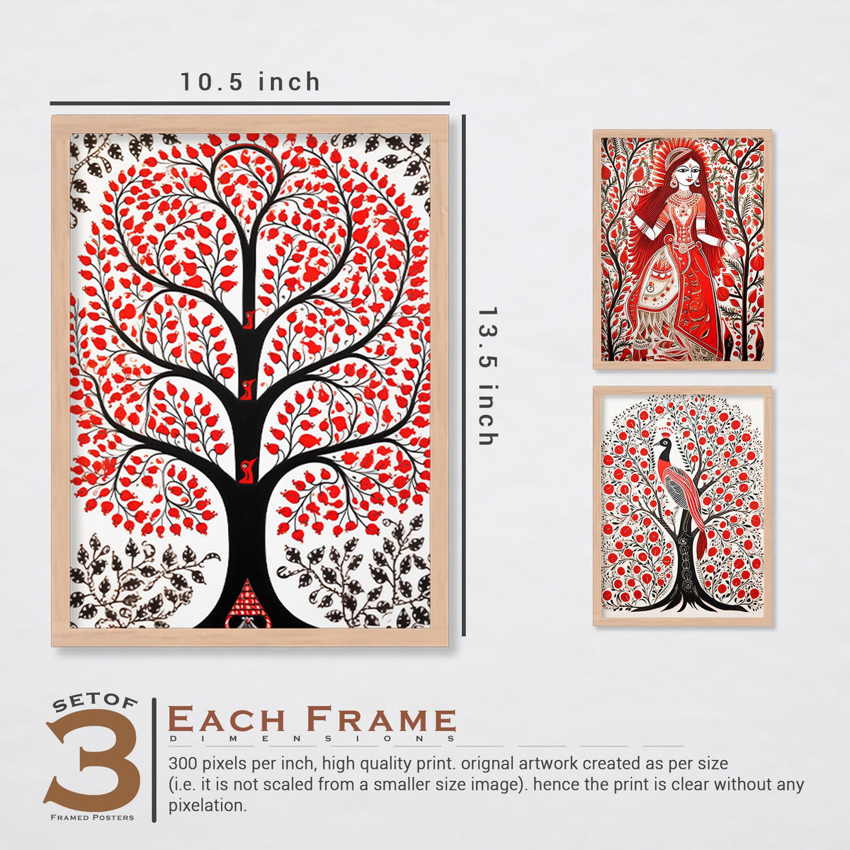 SIZE AND QUALITY Dimension:- 10.5 inch x 13.5 inch and 13.5 inch x 17.5 inch Print Quality: The artwork is printed on 300 GSM thick paper with high quality printer and vibrant colours, to give it rich look.